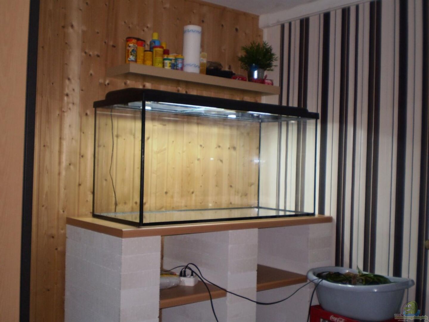 wulstverklebtes Aquarium aus Einzelanfertigung mit Längs- und Querstreben selbstgebauter Unterschrank aus Porenbetonsteinen und Arbeitsplatte (38mm) als Deckplatte und als Regalböden. Die Porenbetonsteine wurden nicht verputzt oder verklebt, sondern nur lose aufeinander gelegt. Hier kann durch die hohe Kraft von oben aber nichts verrutschen. In einer Reihe wurden Aluminiumvierkanthohlprofile in den Stein geschlagen. Diese dienen als Auflageflächen der Zwischenböden. Zuletzt wurde [...]