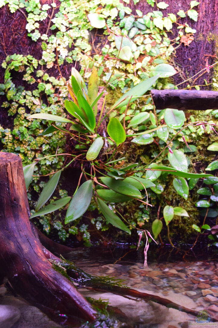 An der Rückwand befinden sich meine Klassiker, wie fast in allen Becken. Ficus quercifolia, Begonia schulzei, Ficus spec. Borneo, Taxyphyllum barbiei. Die Wurzeln hängen bereits in den Wasserteil und sind mit dem etwas Nährboden von Dennerle in den Kies gedrückt worden. Orchideen: Pleurothlis schweinfurthii, Pleurothalis phalangifera Landteil: Bewurzelte Stecklinge von Hygrophila pinnatifida, die bereits emers vorgezogen waren, eine 5-er Gruppe Ophiopogon japonicum, die untersten Spitzen [...]