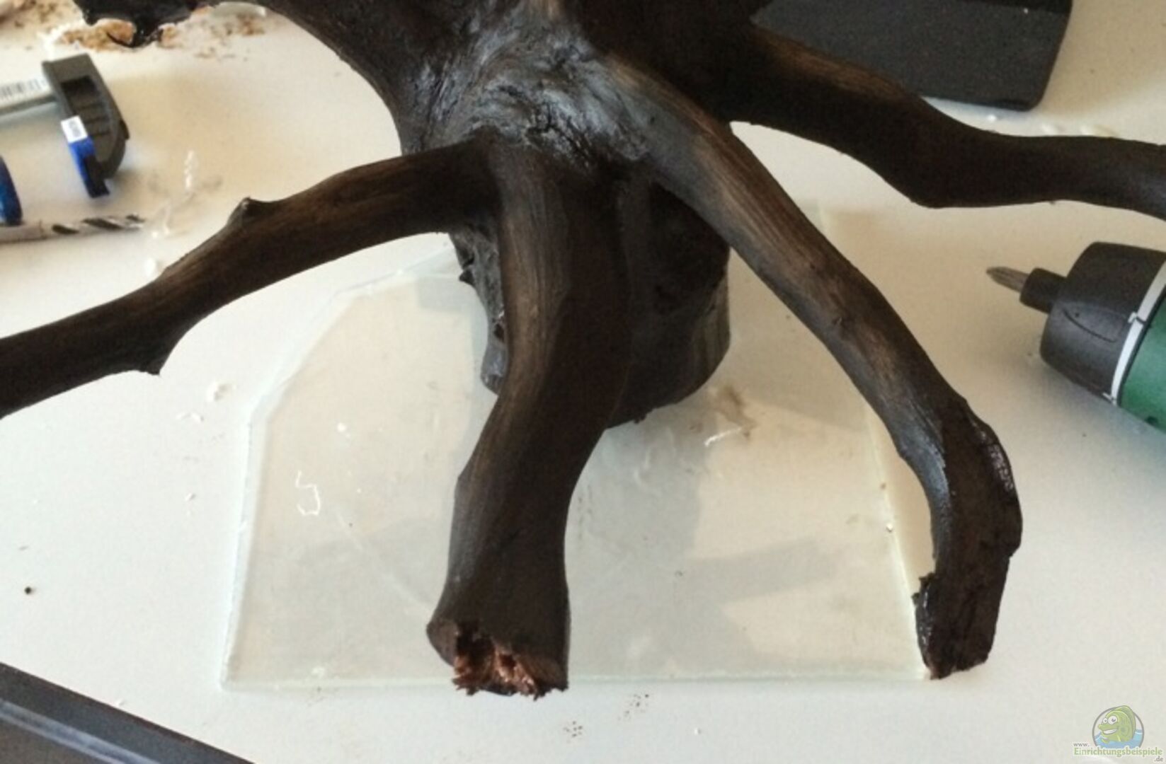 eine Moorkienwurzel Wichtig war mir, dass es sich um eine Wurzel am Stück handelt. Dies soll auch in der Gestaltung später hervorgehen. Ich habe die Wurzel auf eine Plexiglasplatte geschraubt einen Stein auf die Platte gelegt und dann das Soil draufgeschüttet - hat bis jetzt Gehalten. Die Idee war trotzdem scheisse, das Soil sinkt in sich zusammen und hat den Stein freigelegt - ja ganz witzig und immer schön glänzend wegen den Schnecken, aber gewollt wars halt nicht. Habe das Problem [...]