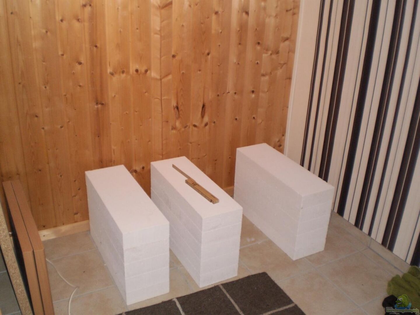 wulstverklebtes Aquarium aus Einzelanfertigung mit Längs- und Querstreben selbstgebauter Unterschrank aus Porenbetonsteinen und Arbeitsplatte (38mm) als Deckplatte und als Regalböden. Die Porenbetonsteine wurden nicht verputzt oder verklebt, sondern nur lose aufeinander gelegt. Hier kann durch die hohe Kraft von oben aber nichts verrutschen. In einer Reihe wurden Aluminiumvierkanthohlprofile in den Stein geschlagen. Diese dienen als Auflageflächen der Zwischenböden. Zuletzt wurde [...]
