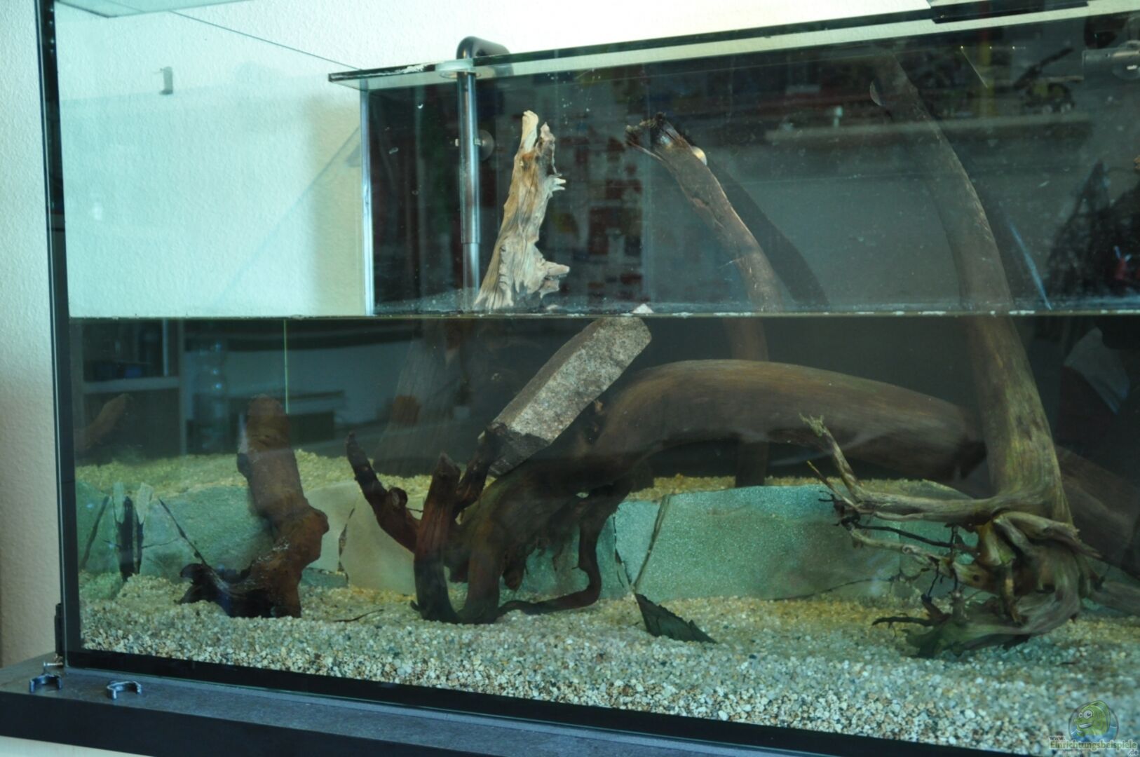 Wurzeln... Wurzeln... Wurzeln... verschiedene Grö??en und Formen. Die einen liegen, andere stehen und welche mit V2A - Schrauben und Saugnäpfen an der Rück- und Seitenscheibe befestigt, die dann bis zum kies reichen und Unterstände und Reviergrenzen schaffen. Zwei Kokosnusshöhlen im Hintergrund und drei Wels - Tonhölen in 2 verschiedenen grö??en.