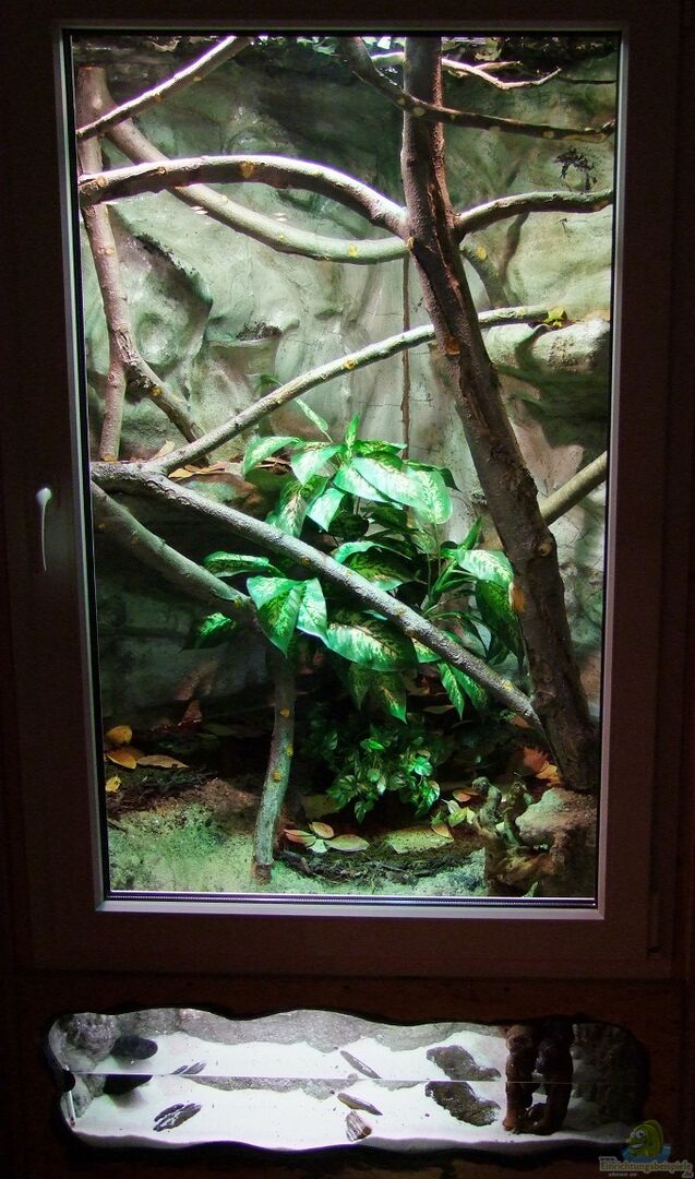 Im Auarium sind ein paar Wurzeln und ein paar Steine Die Rückwand geht nahtlos als Ufer in den Boden des Landteils über Die Einrichtung im Landteil besteht überwiegend aus Apfelbaum und Kirschbaum ??sten aus dem Garten sowie ein paar Steinen die als Zone ohne Bodengrund dienen. Eine Eiablagestelle für Lucy gibt es im hinteren Bereich (Dicker Bodengrund, versteckt hinter der Kunstpflanze, warm und viel Regen - also feucht)