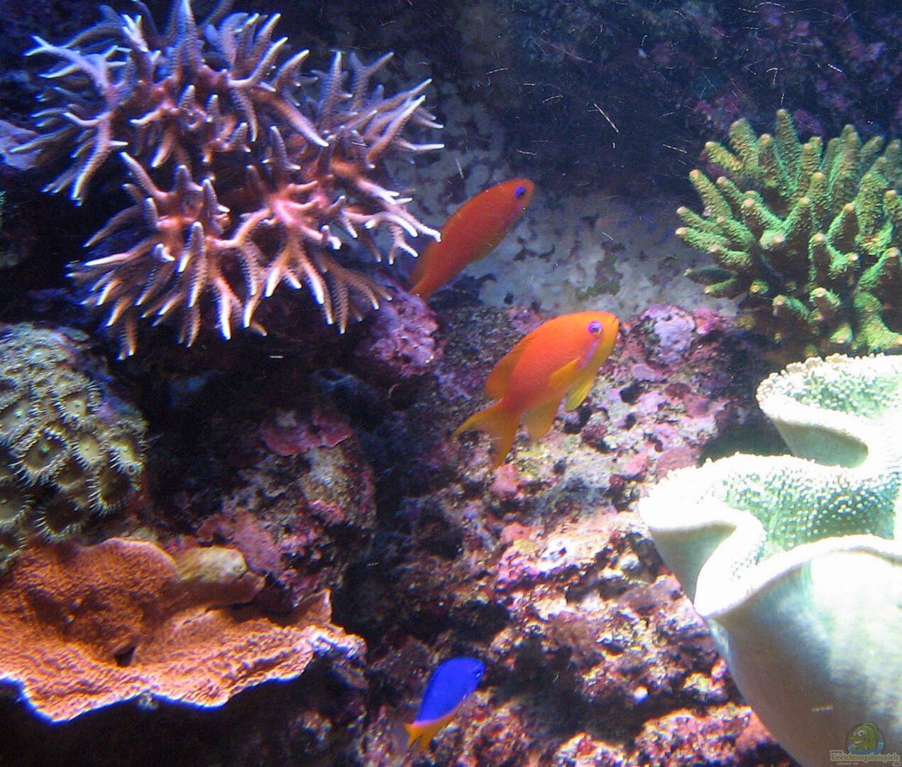Fische: - 3 x Chromis viridis - grünes Schwalbenschwänzchen - 6 x Pseudanthias squamipinnis - Juwelen Fahnenbarsch - 3 x Pterapogon kauderni - Kardinalbarsch (eigene Nachzucht) - 2 x Amphiprion ocellaris - Falscher Clown-Anemonenfisch - 2 x Chrysiptera hemicyanea - Arzur Riffbarsch - 1 x Acanthurus leucosternon - Pazifik Wei??kehldoktor - 1 x Paracanthurus hepatus - Paletten Doktorfisch - 1 x Zebrasoma scopas - Brauner Segelflossen-Doktor - 1 x Labroides dimidiatus - Putzerlippfisch - [...]
