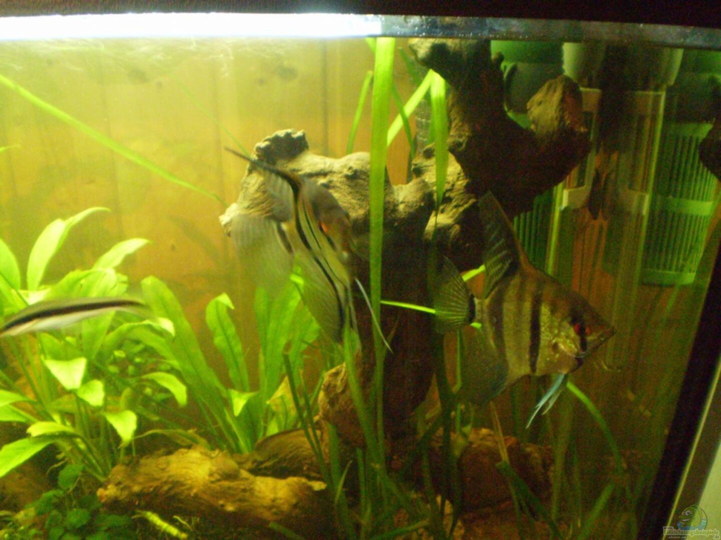 6 Skalare, 3 m / 1w; 2? 15 Zitronensalmler ( Hyphessobrycon pulchripinnis ) 8 Königssalmler ( Inpaichthys kerri ) 1 Thomas Prachtbarsche ( Anomalochromis thomasi ) 3 Siamesische Rüsselbarben ( Crossocheilus siamensis ) 5 Marmorierte Panzerwelse ( Corydoras paleatus ) 3 Blaue Antennenwelse ( Ancistrus dolichopterus) 1 Zierbindenzwergschilderwels ( Peckoltia vittata ) 1 Wabenschilderwels ( Glyptoperichthys gibbiceps ) 1 Liniendornwels ( Platydoras costatus ) 1 Saugschmerle ( Gyrinocheilus [...]