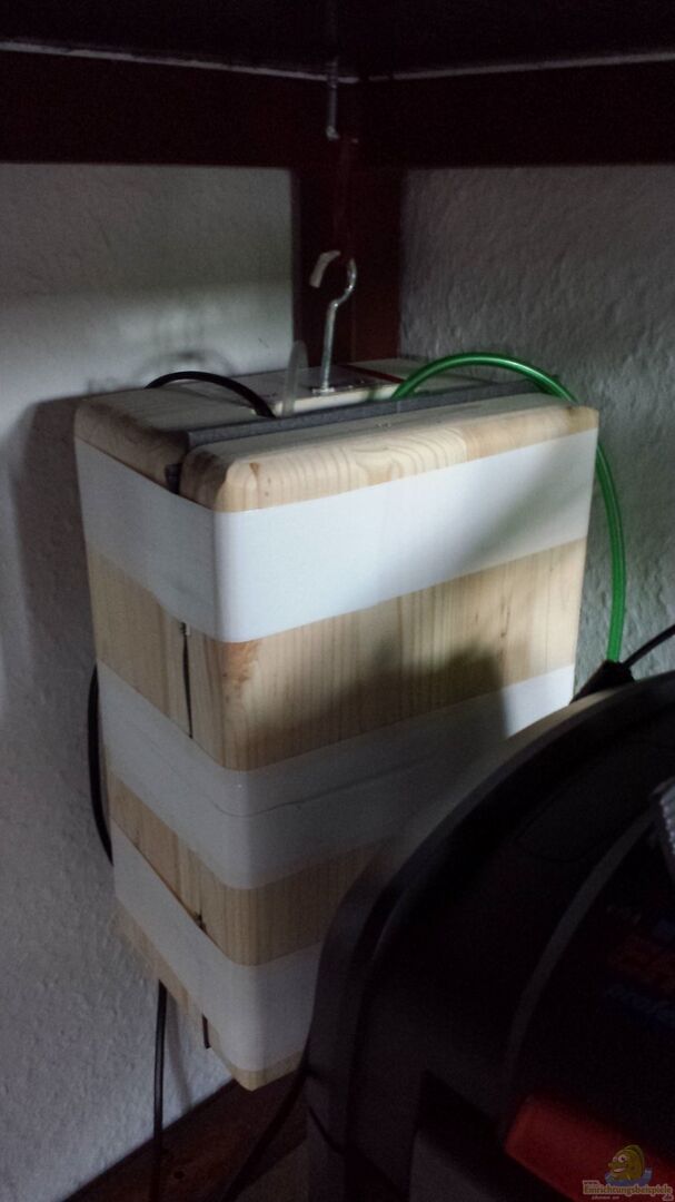 Jäger 250 Watt Regelheizer Schego Ideal Memranpumpe (150l/h) Eingebaut in gedämmter Holzbox aufgehangen im Schrank, kaum hörbar. Lindenholzausströmer