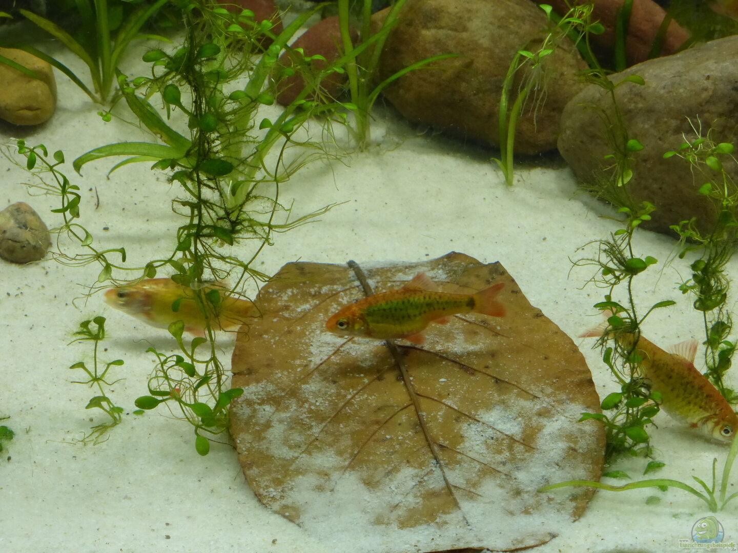 Puntius semifasciolatus (Brokatbarbe 13x) Tanichthys albonubes (Kardinalfisch 10x, ehemals 12x) Ancistrus spec. (Antennenwels 1w) Melanoides tuberculata (Turmdeckelschnecke) Physella acuta (Spitze Blasenschnecke) Planorbella duryi (Kleine Posthornschnecke)