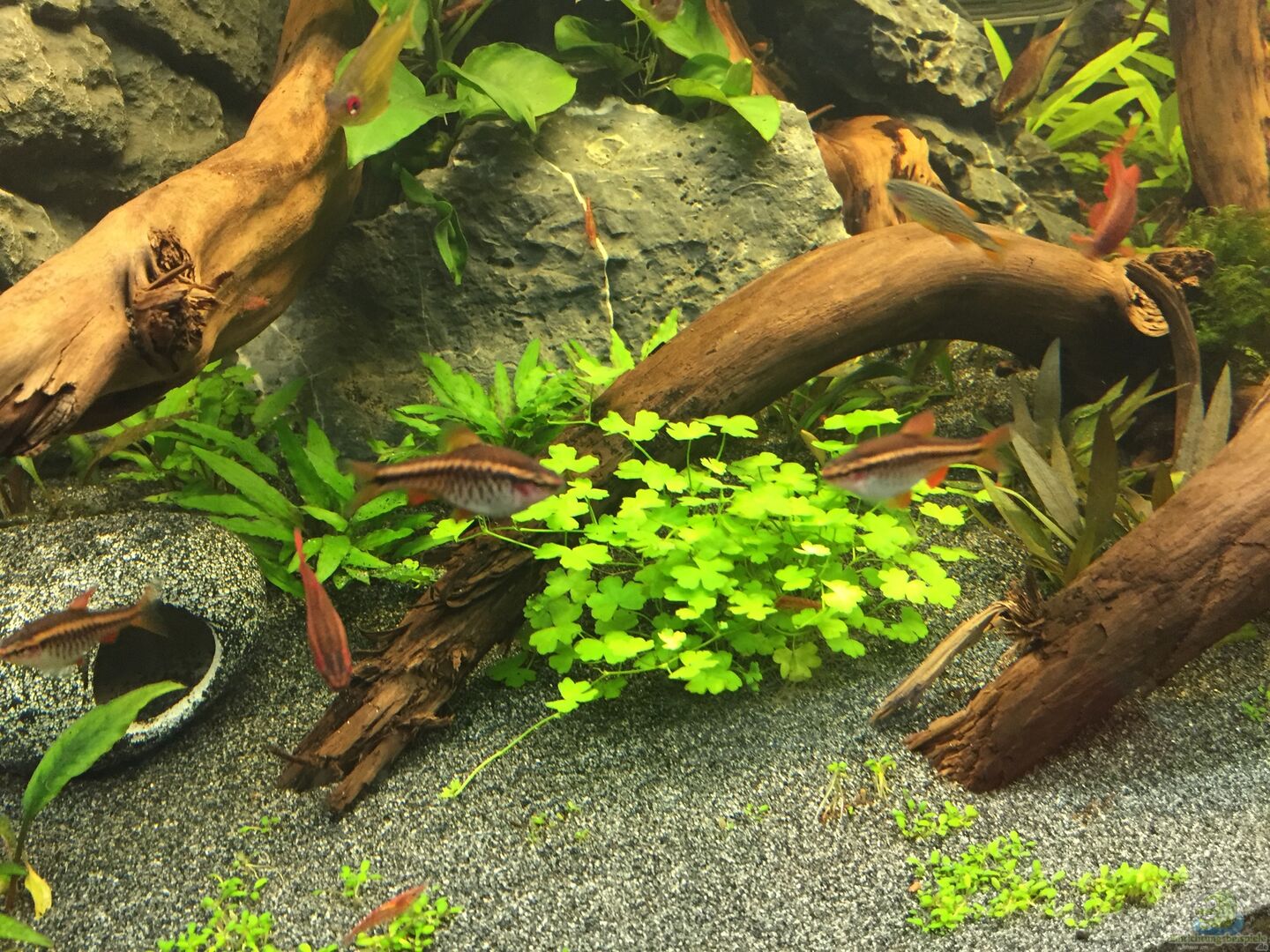 Bei dem Besatz herrscht noch ein bisschen Durcheinander, da ich aus meinen restlichen Aquarien Restbestände an Salmlern und Bärblinen eingesetzt habe. In Zukunft soll das Becken vorwiegend kleinbleibende Arten beherrbergen (fett gedruckt). 12x Otocinclus hoppei (Ohrgitterharnischwels): Absolut zu empfehlender und emsiger Wels, der in Gruppen gehalten werden sollte. 8x Hyphessobrycon pulchripinnis (Zitronensalmler): Aufgrund der neuen Beleuchtung und des dunklen Bodengrundes haben [...]