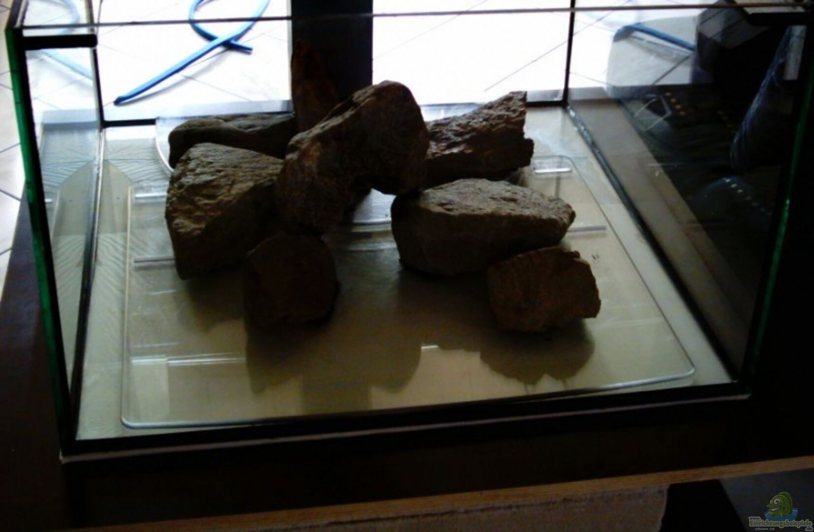 Glasstärke 10 mm Kanten geschliffen und poliert, sto??verklebt. Abdeckung: Aluprofil schwarz Unterbau aus Schalenholzplatten und Ytongsteinen. Unter dem Becken und der Bodenplatte je eine 10mm Plastazoteplatte als Unterlage. 8mm Plexiglasscheiben als Bodengrund zum Schutz der Glasscheibe.
