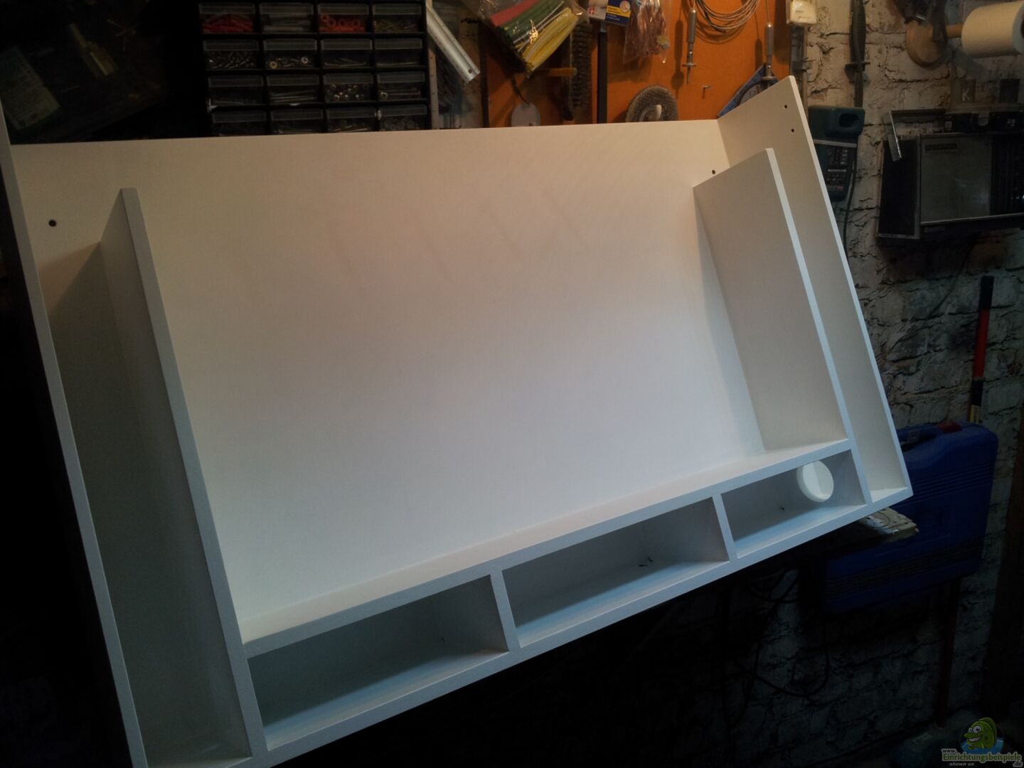 Rahmen, Becken und Beleuchtung komplett Eigenbau. Effenktives Wasservolumen ca 50-55l. Für Zuchtversuche: mini Becken, das ohne extra Pumpe auskommt und hinter dem Rahmen Platz findet. (Gerade im ersten Testlauf!)