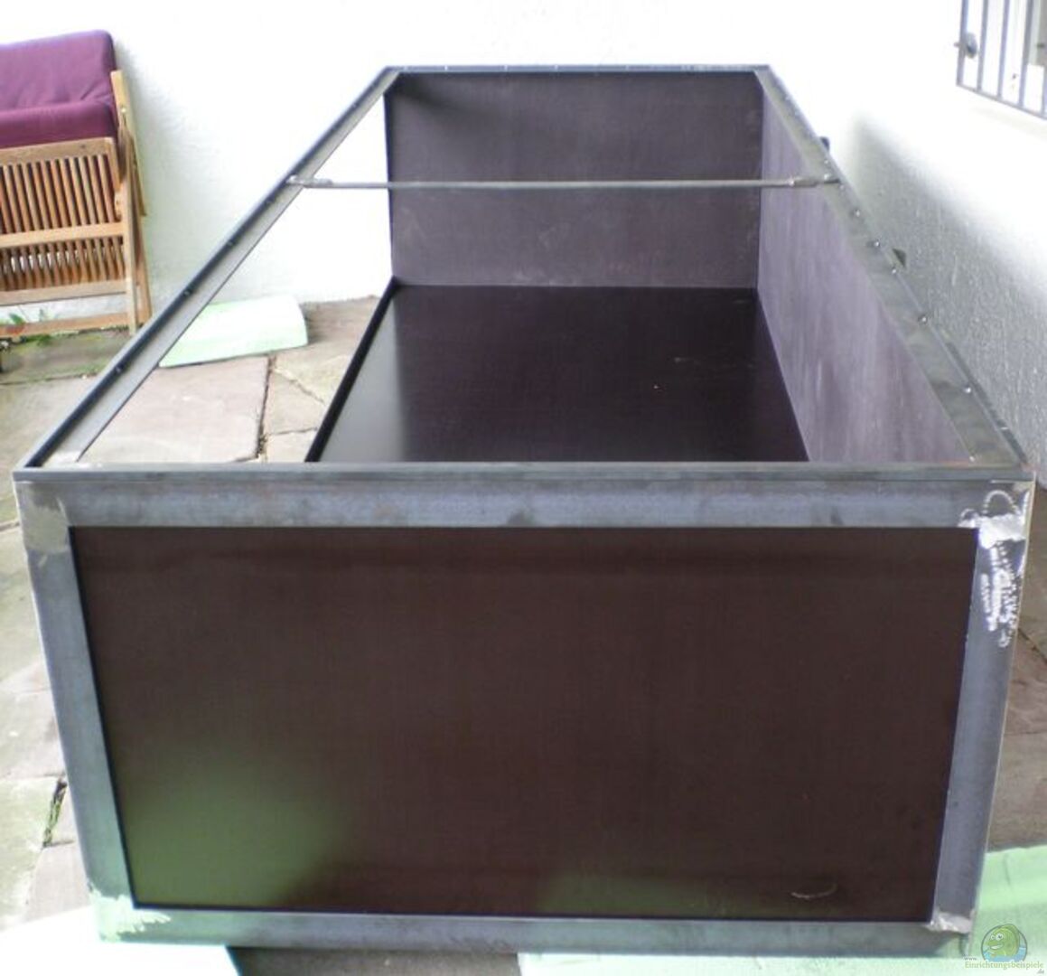 Das Aquarium ist ein Eigenbau Die Idee und Planung zog sich weit über 6 Monate hin Die Umsetzung und der Bau dauerte noch einmal 9 Monate Massiver Stahlrahmen aus 6 mm Winkelstahl Siebdruckplatten in 18 mm Stärke 15 mm Sichtscheibe