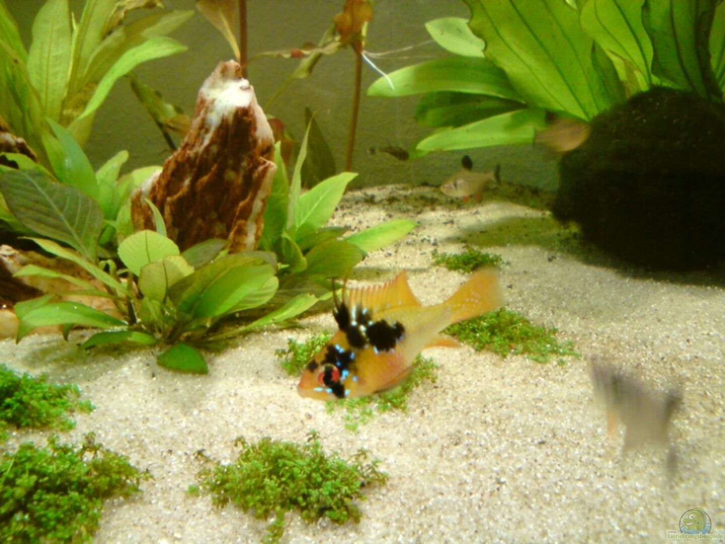 1/1 Microgeophagus ramirezi (Schmetterlingsbuntbarsch) 1/1 Apistogramma nijsseni (Pandazwergbuntbarsch) 25 x Hasemania nana (Kupfersalmler) 12 x Hyphessobrycon flammeus (Roter von Rio) 12 x Hyphessobrycon megalopterus (Schwarzer Phantomsalmler) 11 x Otocinclus macrospilus (Ohrgitter-Harnischwels) 2x L162 hinzukommen sollen noch 8 Corydoras trilineatus