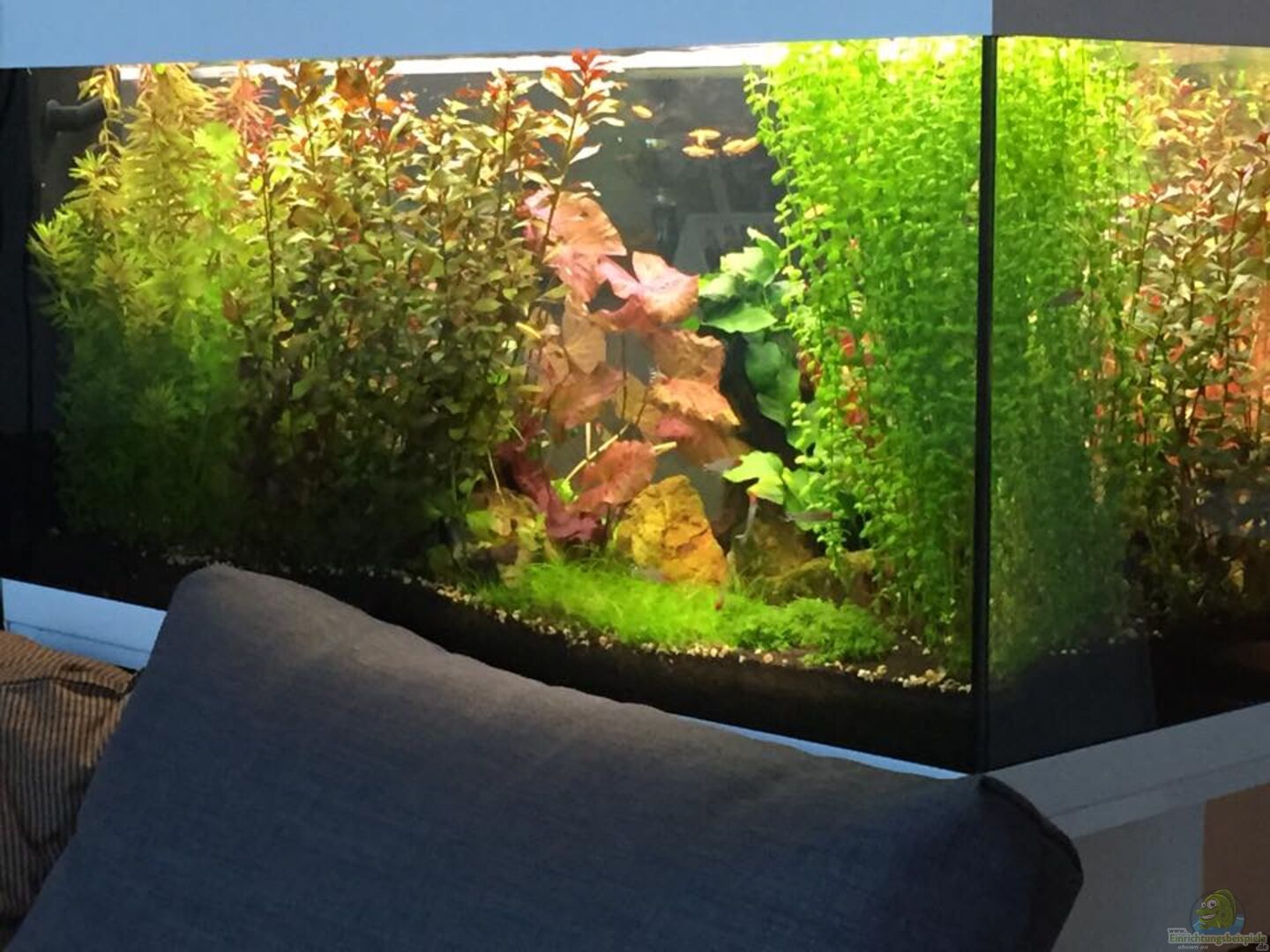Das Becken fungiert als Raumteiler und ist von 3 Seiten aus Einsehbar. Dennoch liegt der Fokus auf der Frontseite, auf der Rückseite befindet sich eine Eckcouch, sodass die dichte Bepflanzung an der Stelle, wo man meist sitzt, bis direkt an die Scheibe geht. Rechts zur Raummitte hin ist auch auf der Rückseite eine kleine freie Fläche, wo sich vor allem der Schwarm Rotkopfsalmler gerne aufhält. So hat man von beiden Seiten aus einen Blick auf die Fische.