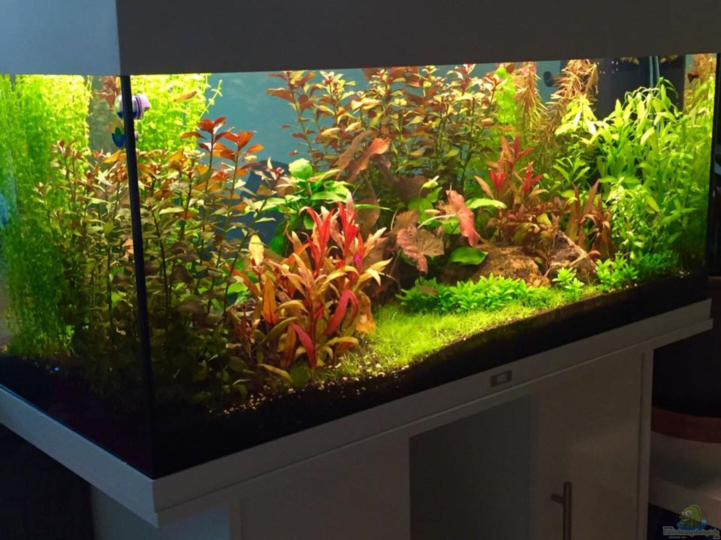 Das Becken fungiert als Raumteiler und ist von 3 Seiten aus Einsehbar. Dennoch liegt der Fokus auf der Frontseite, auf der Rückseite befindet sich eine Eckcouch, sodass die dichte Bepflanzung an der Stelle, wo man meist sitzt, bis direkt an die Scheibe geht. Rechts zur Raummitte hin ist auch auf der Rückseite eine kleine freie Fläche, wo sich vor allem der Schwarm Rotkopfsalmler gerne aufhält. So hat man von beiden Seiten aus einen Blick auf die Fische.