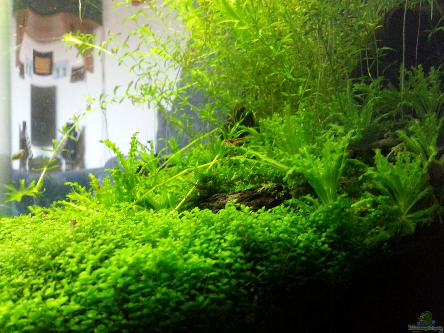 Die Vorrichtung des Hamburgermattenfilter ist mit Schieferstückchen beklebt. Die selbstgebaute Schieferrückwand ist ebenfalls fest eingeklebt. Die Seiten der Rückwand sind nicht komplett geschlossen. So haben die Garnelen die möglichkeit sich dahinter zu verstecken. An dieser Stelle gab es schon interessante Beobachtungen. Mittlerweile sucht hat auch die Wasserpest die Lücken entdeckt und wächst fröhlich dahinter weiter.