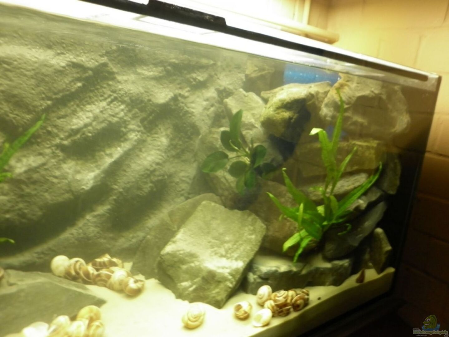 Rückwand: Eigenbau, genaueres bei Tanganjika ??bergangszone Steine: ca.100Kg ``graue Wacke`` von der Schurenbachhalde in Altenessen (graue Wacke nennt die mein Opa der die seiner zeit aus der zechengrube geholt hat) Sonstiges: Weinbergschneckenhäuser, für den Anfang ca. 30-50. Ich werde noch einige nachlegen müssen, wenn die Callipterus sich die gegenseitig klauen.