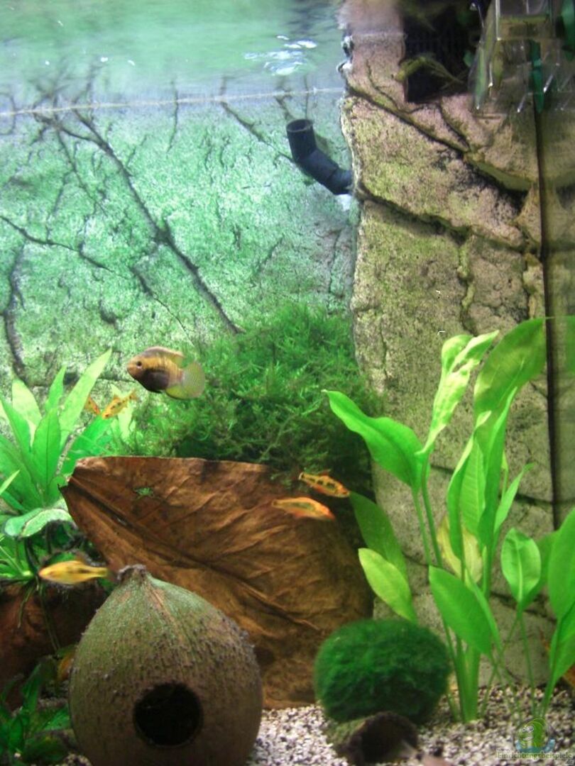 Eine kleine Höhle aus Steinen (aus einem Bach). Eine Gro??e Wurzel die zum Teil mit Javamoos bewachsen ist. Zwei Welshöhlen die zu 3/4 in den Kies eingegraben sind.