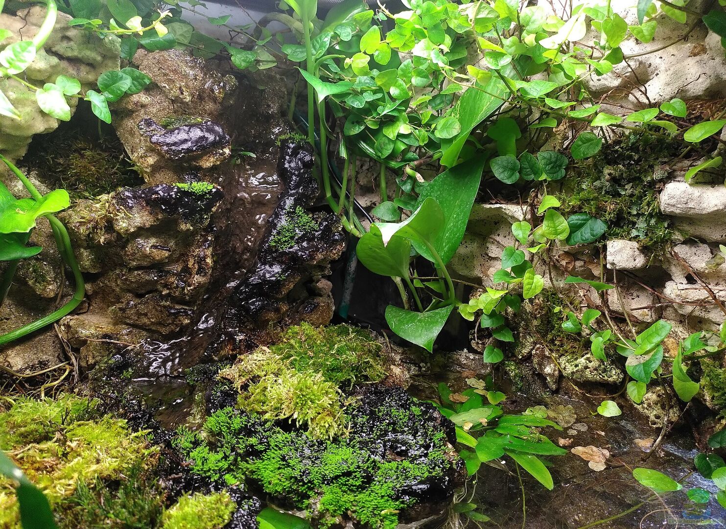 Aquaterrarium ExoTerra Die Silikonnähte im Wasserteil wurden zusätzlich mit Silikon nachgezogen, da werksseitig nicht ganz wasserdicht. Anschließend wurde der Innenausbau auf Basis von Styropor gestaltet. Der Landteil steht auf Säulen aus PVC-Rohren, beklebt mit Styroporstücken. Auf Höhe des Wasserspiegels wurden "Plateaus" gestaltet, auf denen Moos wachsen soll. Im hinteren Bereich wurden zudem durch schräg zum Boden verlaufende Styroporplatten Pflanzbereiche sowie Platz [...]