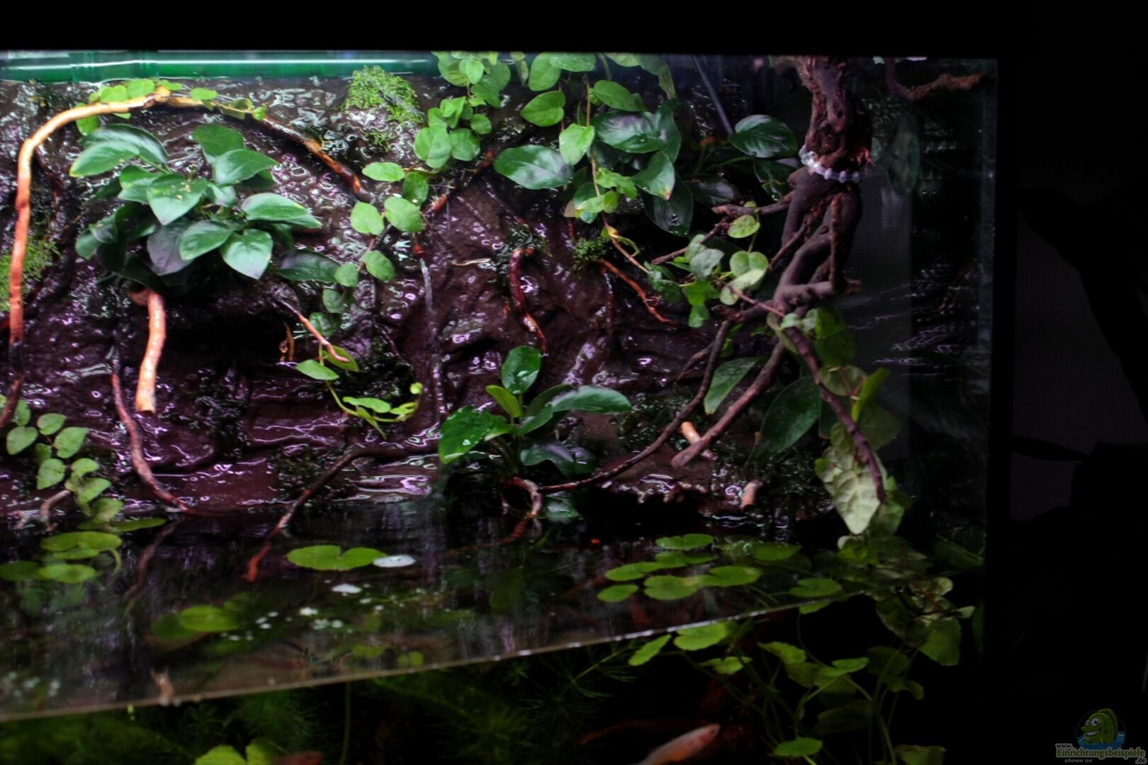 Rückwände: Im Becken ist im Submersen Teil eine geteilte Mangrovenrückwand angebracht. Im emersen Teil habe ich eine Rückwand gebaut welche ständig von oben mit Wasser überlaufen wird. Die Rückwand besteht aus Styropor und Styrodur. Anfangs habe ich eine grobe Struktur geschaffen und diese verklebt. Danach würde das ganze etwas "angesenkt" um weitere Struktur zu schaffen. Dann habe ich alles mit Gewebematten belegt um anschliessend Gewebespachtel gemischt mit Abtönfarbe [...]