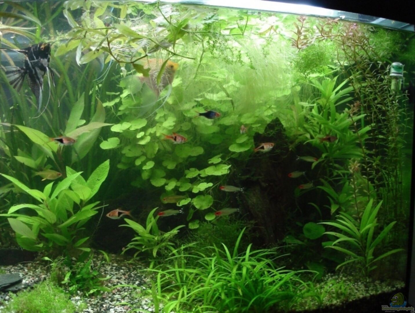 Vordergrund: Vesicularia dubyana - Javamoos - teilweise auf und an den Wurzeln Hemianthus callitrichoides Cuba - Zwerg-Perlkraut Rotala rotundifolia - Kleinblättrige Rotala Anubias barteri nana - Zwergspeerblatt Mittelgrund: Anubias barteri ???Coffeefolia??? - Kaffeeblättriges Speerblatt Cryptocoryne wendtii Hygrophila corymbosa - Kirschblatt-Riesenwasserfreund Ludwigia glandulosa - Rote Sternludwigie Hintergrund: Hygrophila polysperma - Indischer Wasserfreund Vallisneria [...]