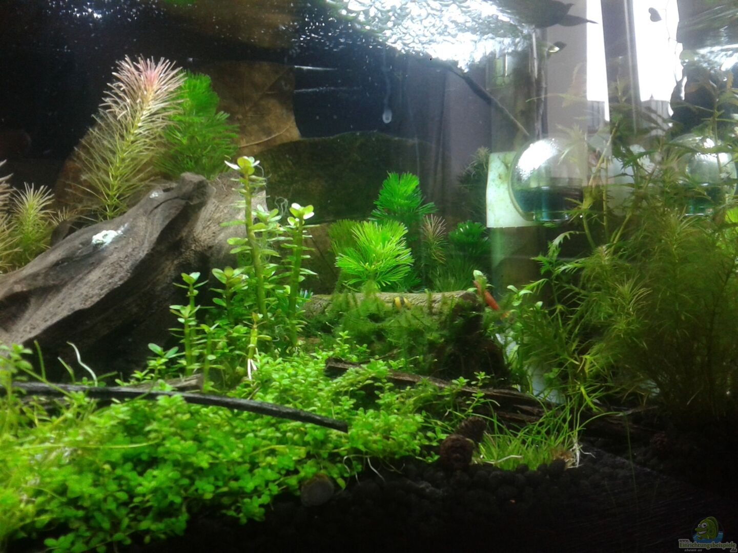 Selektionsbecken für 2 Zuchtbecken selber Grö??e. Alle sind ein wenig im Aquascaping-Stil angelegt und sind durch den starken Pflanzenwuchs passend für die Bedürfnisse der Garnelen eingerichtet. Rückscheibe ist für mehr Tiefenwirkung mit schwarzer Folie beklebt.