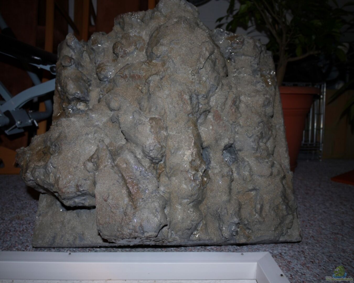 Lochgestein zu lockeren Steinhaufen aufgetürmt. Der Bodengrund geht teilweise bis an die Rückwand.(Tiefenwirkung)