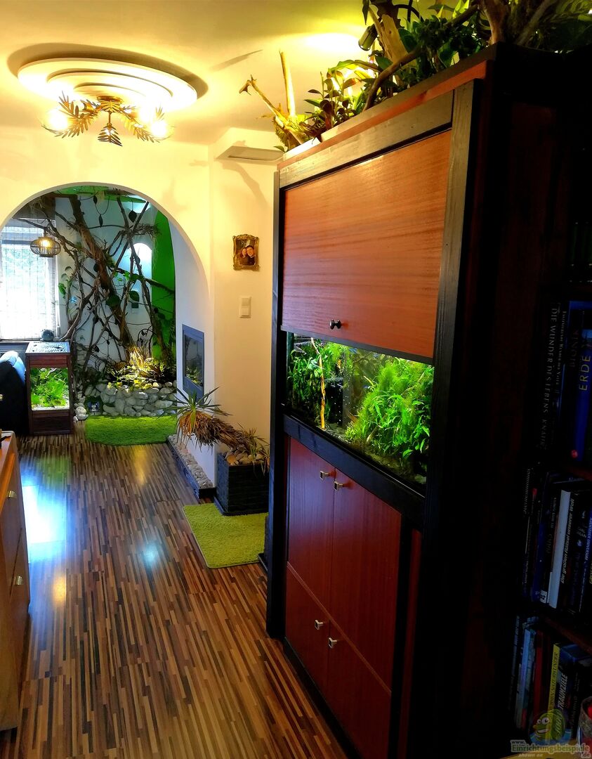Der Haupt-Hintergrund im Aquarium ist mit einer selbstgebauten Rückwand versehen. Sie besteht aus Styropor, Fliesenkleber, schwarzem Aquarium-Kies und Asche vom Holzofen, damit das Ganze realistischer aussieht. Diese künstliche Felswand habe ich mit Höhlen und Löchern - Versteckmöglichkeiten für die Welse - versehen und alles mit Epoxit-Harz versiegelt. Holz und Wurzeln habe ich bei einem nahen Fluss gesammelt. Das Holz habe ich zusätzlich mit Edelstahl-Schrauben unsichtbar verschraubt, damit [...]