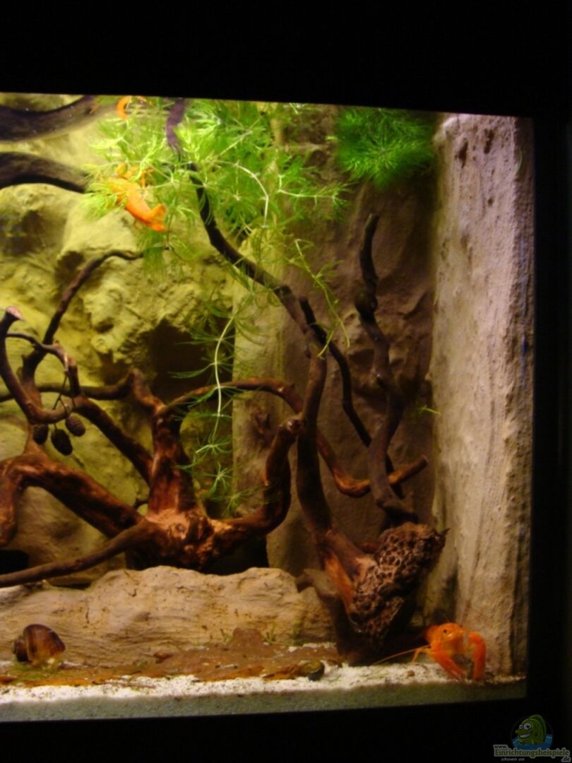 Standard-Glasbecken, Kiesblende und Abdeckung (die obere Wasserlinie und der entstehende Kalkrand sind somit nicht zu sehen) mit der Beleuchtung von einem alten Juwel-Becken übernommen, passend lackiert. Rück- und Seitenwände selber gebaut aus Styrodur und eingefärbtem (Abtönfarbe) Portlandzement, mehrere Höhlen für einen ausgewachsenen Krebs und eine Aussichtsplattform integriert, der Innenfilter ist komplett verkleidet, der Wasserauslauf des Innenfilters ist aus dem Becken herausgeführt, [...]