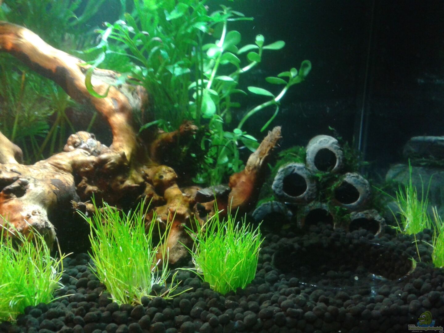 Zuchtbecken für blaue Tigergarnelen. Alle 3 Becken sind ein wenig im Aquascaping-Stil angelegt und sind durch den starken Pflanzenwuchs passend für die Bedürfnisse der Garnelen eingerichtet. Rückscheibe + eine Seitenscheibe sind für mehr Tiefenwirkung mit schwarzer Folie beklebt.