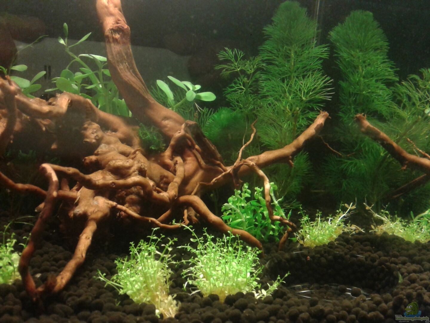Zuchtbecken für Rote Taiwan Sakura Garnelen. Alle 3 Becken sind ein wenig im Aquascaping-Stil angelegt und sind durch den starken Pflanzenwuchs passend für die Bedürfnisse der Garnelen eingerichtet. Rückscheibe + eine Seitenscheibe sind für mehr Tiefenwirkung mit schwarzer Folie beklebt.