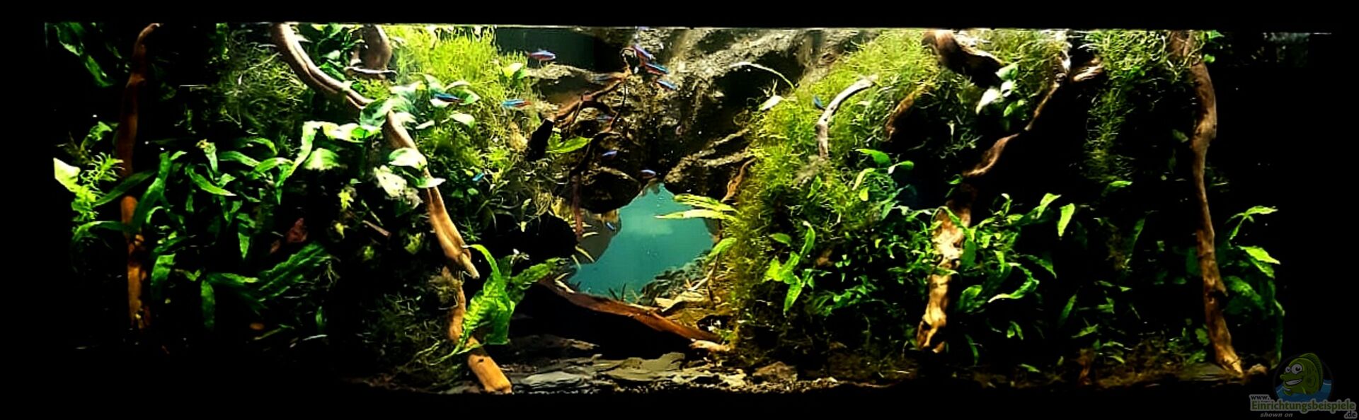 Die Besonderheit bei diesem Aquarium ist das blaue Loch in der Mitte. Man schaut durch das Becken hindurch in den Kellerabgang. Die gegenüberliegende Wand entlang der Kellerstiege wurde mit einer passenden Fototapete versehen. Der Boden der Mauer vom Durchbruch ist mit einem Diorama verschönert, mit Moos aus dem Wald, Holz, Schiefersteinen und passenden Plastikpflanzen. Durch diesen optischen Trick, glaubt man, dass dieses Becken extrem tief hinein führt. Das Ganze hört aber in Wirklichkeit schon [...]