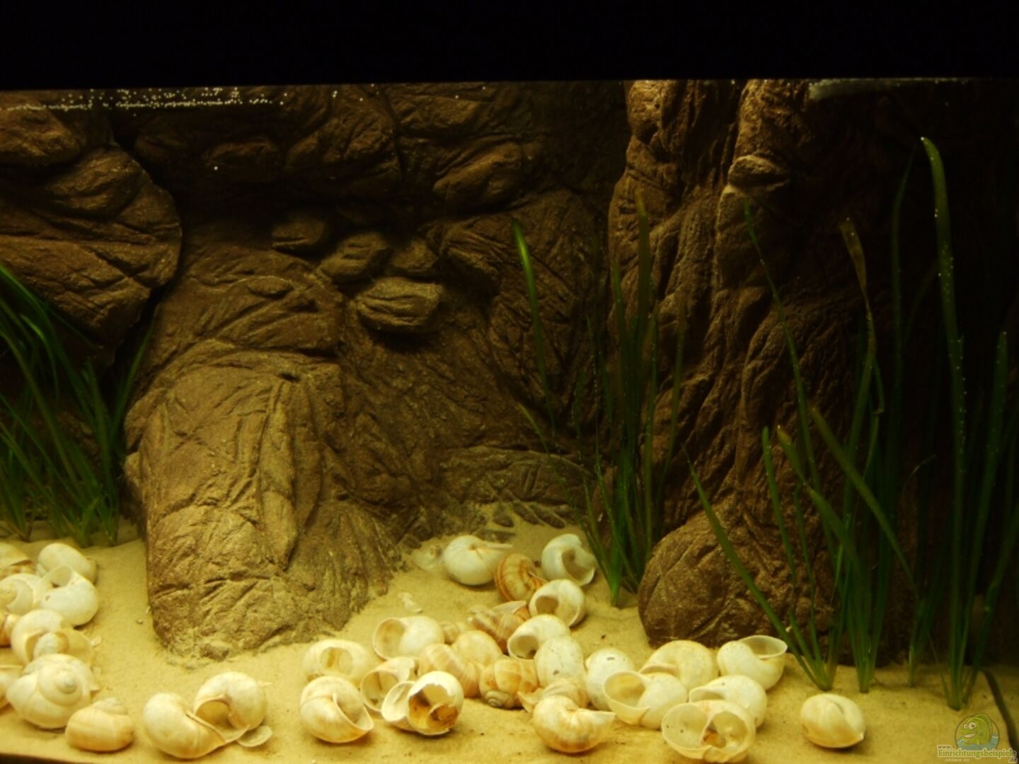 Selbstgebaute Felsrückwand aus Portlandzement bestehend aus drei Modulen, die ich mit brauner Abtönfarbe noch etwas abgedunkelt habe. Hinter dem Element ganz rechts versteckt sich der HMF. Das mittlere Element ist so gebaut, dass das Becken in zwei ungleich gro??e Reviere aufgeteilt wird.