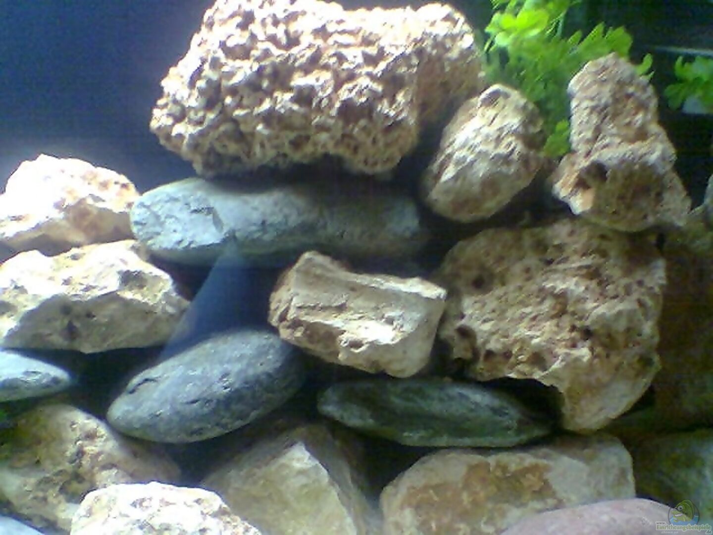 ca. 30 kg Lochgestein aus dem Baustoffhandel ca. 35 kg gro??e Flusskiesel und Diskus Grey alles aufgebaut auf Styropor. Links und rechts höher gestapelt mit vielen Hölen und versteckmöglichkeiten. Bewusst auf eine 3D Rückwand verzichtet, um den Schwimmraum auf grund des kleineren Beckens nicht noch weiter einzuengen. Stattdessen nur von der Rückseite mit Schwarzer Folie beklebt.