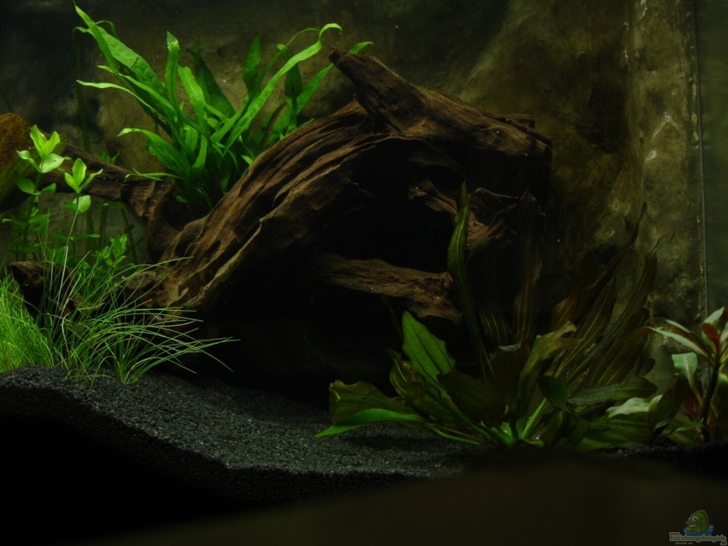 Wegen Wohnungsumräumaktion aufgrund von baldigem menschlichen Nachwuchses, musste das Becken umziehen und ist in dem Zuge auch gleich umgebaut worden. Rückwand Marke Eigenbau aus Styropor und Bauschaum. Beschichtet mit eingefärbtem Portlandzement und versiegelt mit Epoxitharz.