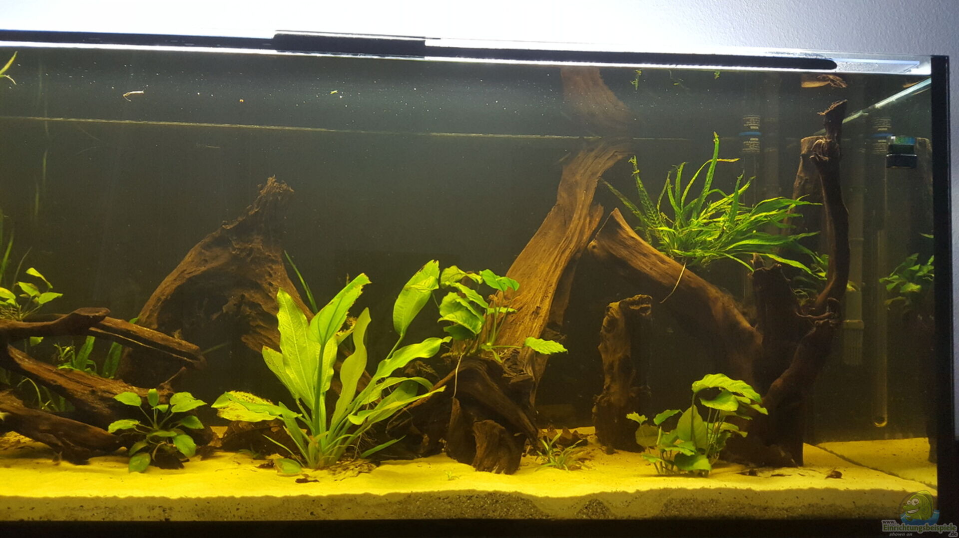 Bei meinem Aquarium handelt es sich um das Model Juwel Rio 400 im Farbstich schwarz. Leer wiegt das Aquarium 86 kg und der Unterschrank hat ein Gewicht von 50 kg. Die Glasplatten haben eine Dicke von 1, 2 cm. Zwischen Glas und Unterschrank befindet sich eine kleine schwarze Matte um Unebenheiten des Aquariums auszugleichen. Den Standort des Beckens habe ich so gewählt, dass möglichst wenig bis gar keine Sonnenstrahlen auf das Becken fallen und möglichst wenig Geschehen um das Aquarium herum [...]
