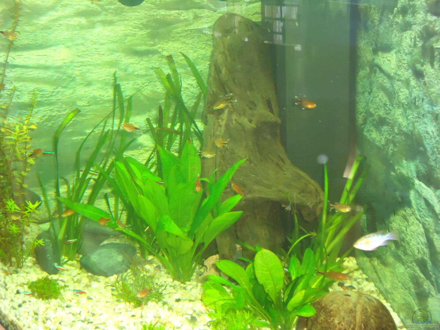 9 rote Neonsalmler 10 Kupfersalmler 5 Orangflossen-Panzerwelse 1 + 1 Antennenwels 3 Amano Garnelen 8 Gabelbeilbauchfisch Fische haben nun Ihr Revier gefunden und scheinen sich wohl zu fühlen , zeigt das allgemeine Verhalten der Tiere