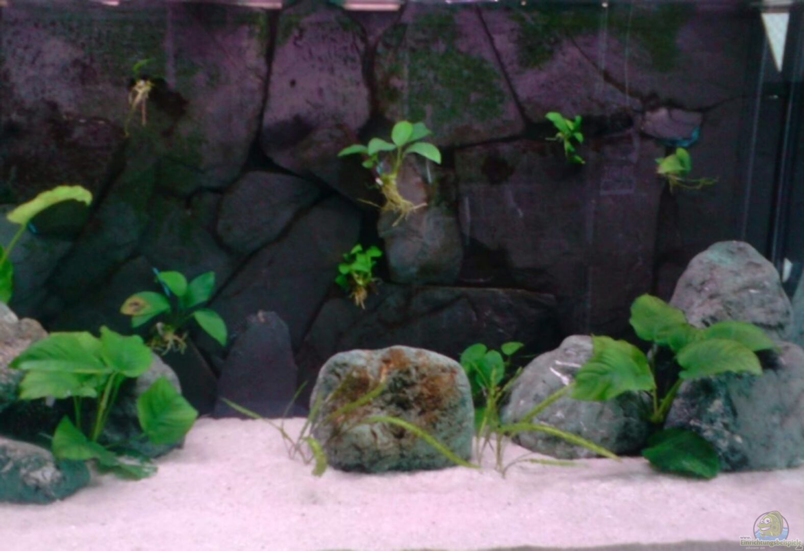 ca. 50kg Schwarze Steine, mit Silikon verklebt Die Rückwand habe ich selbst gemacht indem ich den Schiefer mit Auariumsilikon an die Scheibe geklebt habe