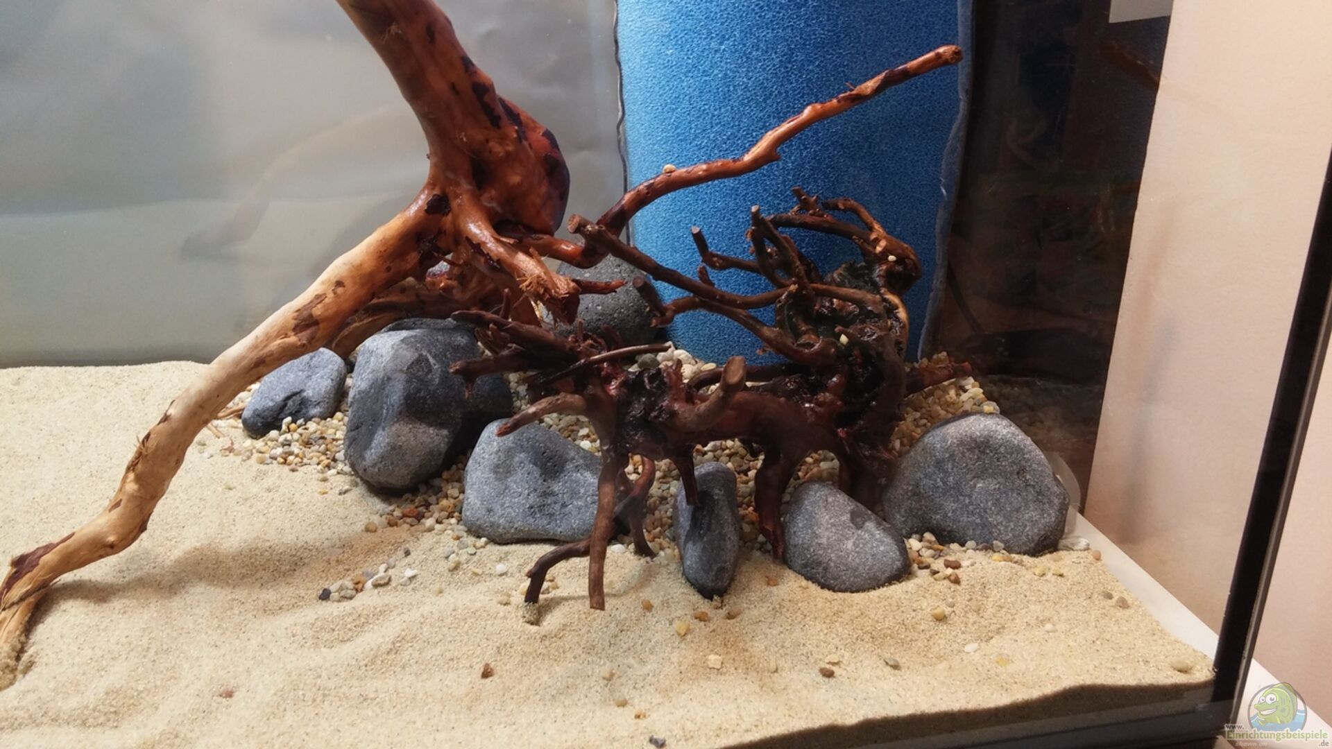 Eheim 126l Aquarium. Ohne Längsstreben. Mit schwarzem Silikon. Eine selbst gebastelte Abdeckung aus Vollholz mit Futterluke . Als Rückwand dient eine statisch klebende Milchglasfolie aus dem Baumarkt. Au??en vorne und hinten 2 Stahlbleche angeschraubt. An ihnen werden nachher Magnete ihren Platz erhalten.