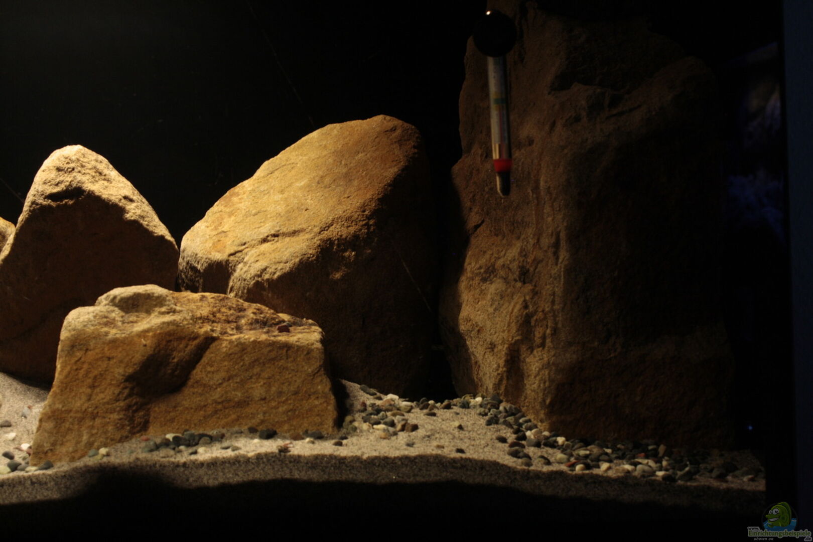 Füe die Dekoration sind ca 120-150kg echte Steine (Ruhrsandstein) zum Einsatz gekommen, welche teilweise (au??en) bis an die Wasseroberfläche reichen, um Georgina die Möglichkeit zu geben auch mal an "Land" gehen zu können. Das ganze soll eine seichte Felszone mit ausreichend Spalten und "Höhlen" suggerieren, damit Georgina sich auch bei belieben "unsichtbar" machen kann. Bei der Einrichtung wurde darauf geachtet, diese "naturnah" zu gestalten. [...]