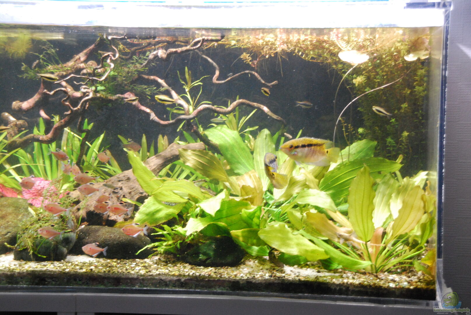 Acrylglas Aquarium, welches nach meinen Vorgaben gebaut wurde. Es besteht aus 15 mm Acrylglas und hat einen oberen Rahmen, damit die Scheiben sich nicht wölben. Das Becken wird nächsten Monat 10 Jahre alt. Es steht auf Röhrenspan-Regalen eines schwedischen Möbelhauses und hat schon 3 Umzüge überlebt.