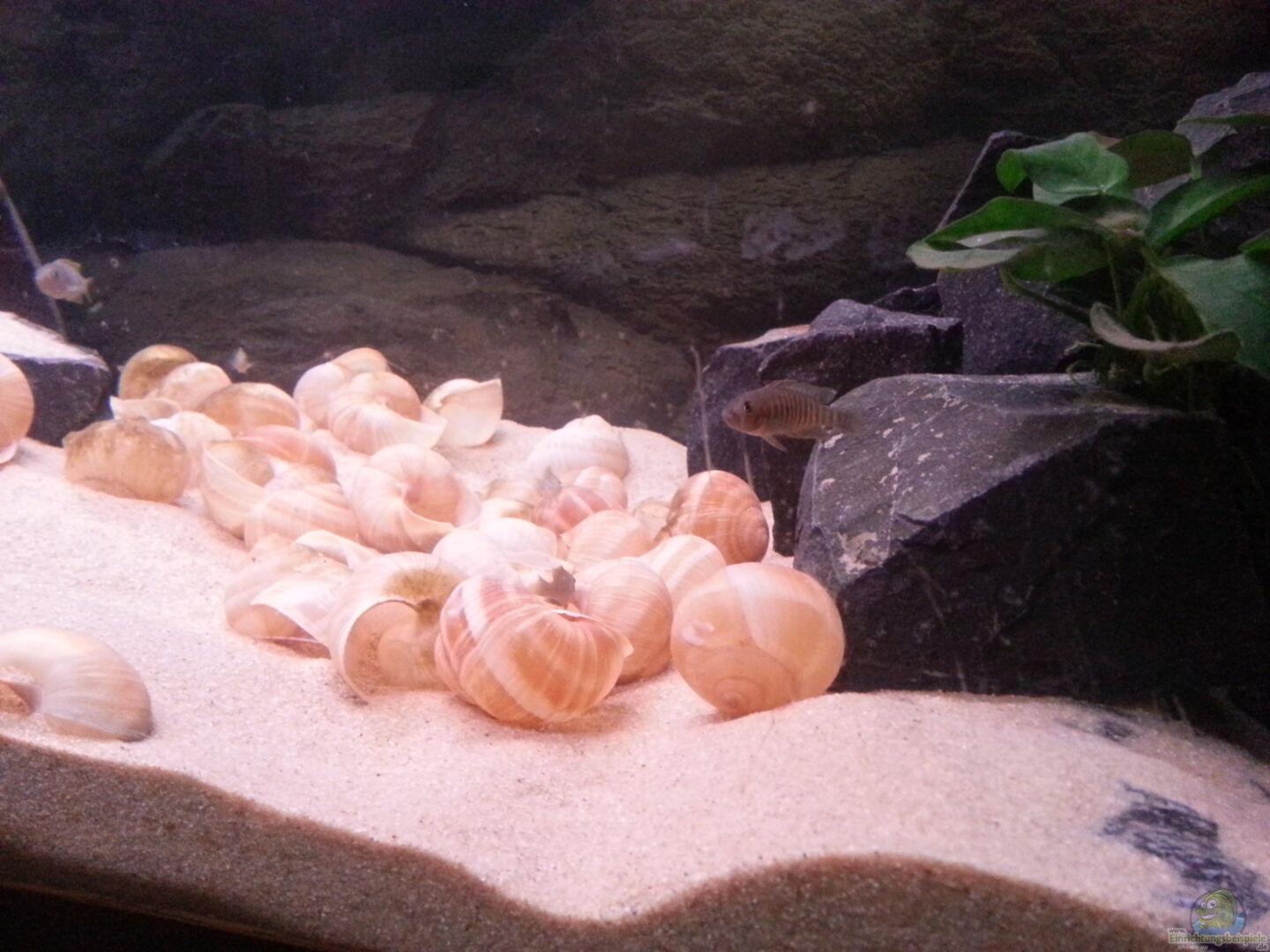 Im rechten und linken Beckenbereich befindet sich ein Steinaufbau aus Basaltgestein. Vereinzelt bilden weitere einzelne Basaltgesteine einige Reviergrenzen. Die rechte Seitenscheibe ist, wie auch der rechte Bodenbereich, mit einem Elemt der Juwel Motivrückwand Stone Granite versehen. Die beiden Elemente hatte ich noch aus meinem 112er Multibecken übernommen, da ich keinerlei andere Verwendung dafür hatte. Die hintere Scheibe des Aquariums ist mit einer Motivfolie im Look "graue [...]