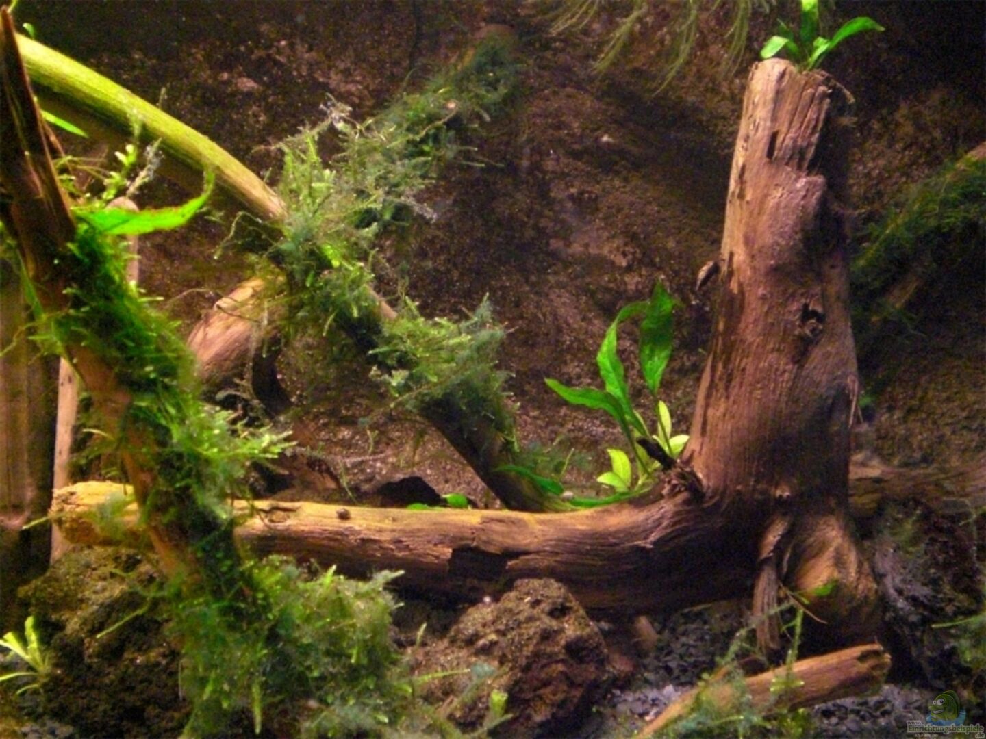 Selbstgesammeltes Treibholz. Links vor HMF und unter der rechten Wurzel: Aufbau aus Lavasteinen, des weiteren Buchen-/Eichenblätter, Brennesselblätter, Walnussblätter, ...