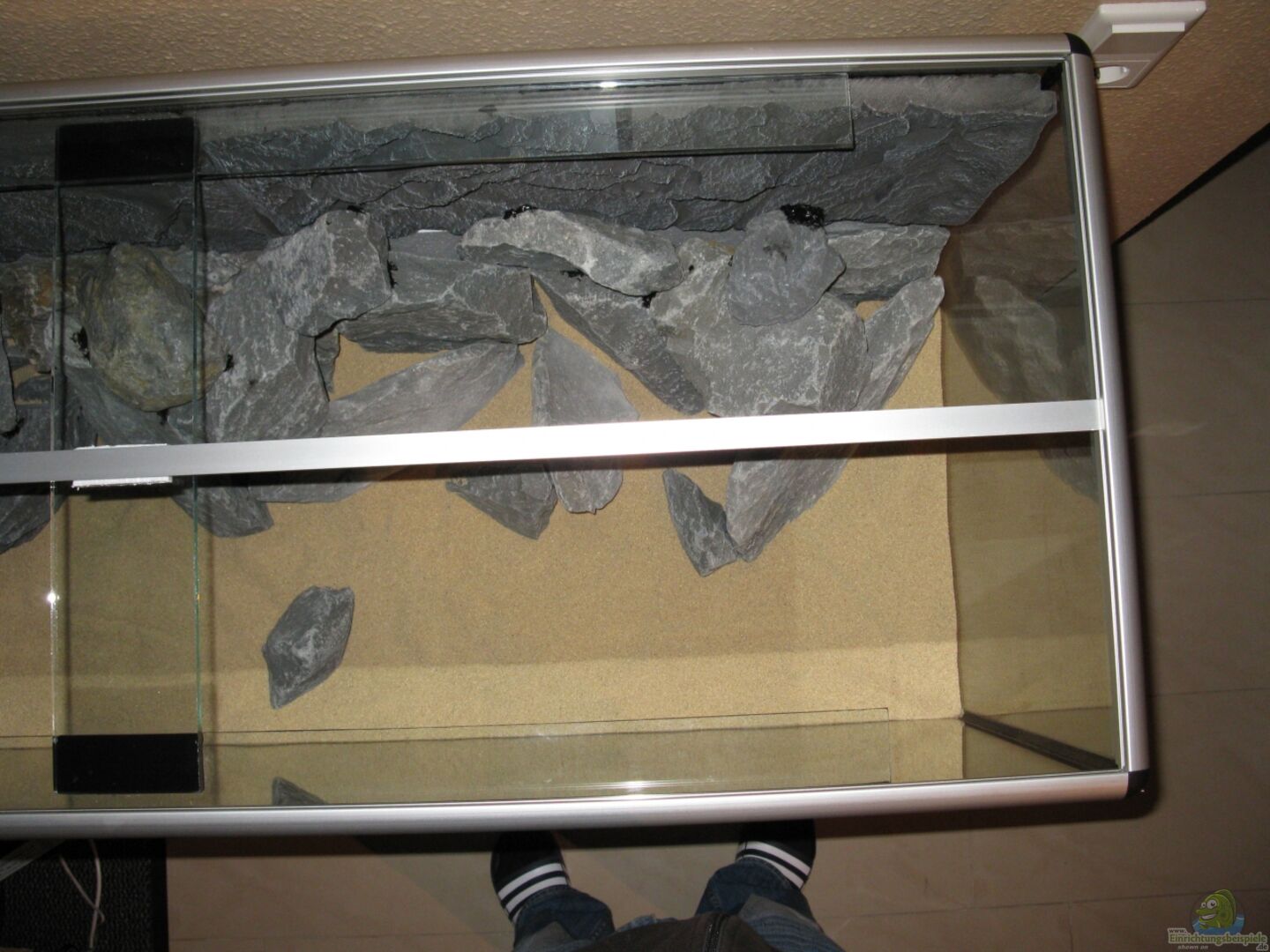Rückwand: Eine Juwel Stone Granite Rückwand - 60 x 55 cm, in der Mitte geteilt und im oberen Bereich an der Aquarium Rückwand mit Silikon fest geklebt. Darunter eine 2cm dicke Styroporlage an der Rückwand befestigt um das Glas vor den Steinaufbauten zu schützen (Eine durchgehende Juwel Stone Granite Rückwand habe ich unten für überflüssig gehalten, da sie sowieso verdeckt sein würde). Steinaufbauten: ca. 80 kg Wasserbausteine seitlich vor dem HMF und an der Rückwand aufeinander [...]