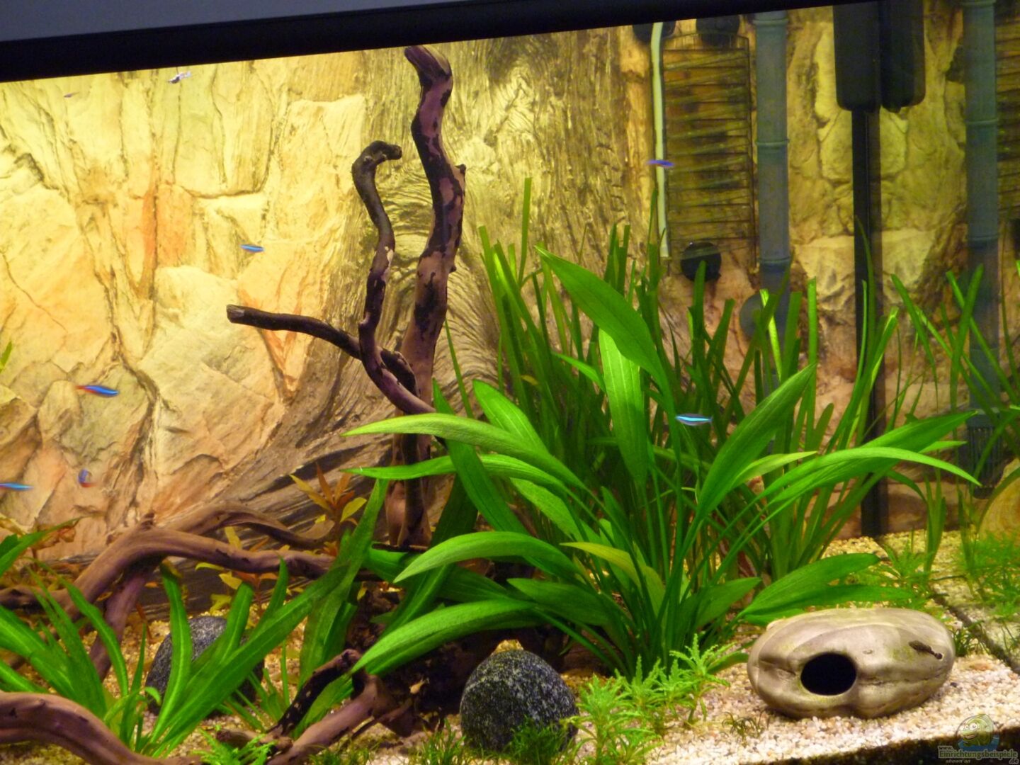Das Becken hat ein Rückwandbild, dies wurde vom Aquarienbauer mit einem speziellen Verfahren auf der Rückseite aufgebracht. Dadurch kein Platzverlust durch Rückwand im Innenbereich und keine Blasenbildung oder andere unschöne Effekte durch Rückwandposter. Den Unterschrank habe ich komplett selbst gebaut. Untere Platte Küchenarbeitsplatte, Aufbau mit Porenbetonsteinen, obere Platte ebenfalls Küchenarbeitsplatte Schiebetüren aus lackiertem Glas