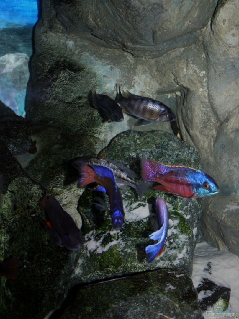 selbstgebastelte Kunstfelsen mit integriertem Felsüberhang in Verbindung mit Granit-Basalt-Steinen aus dem heimischen Steinbruch; Hintergrund selbstgemalt - Unterwasser-Landschaft im Malawisee