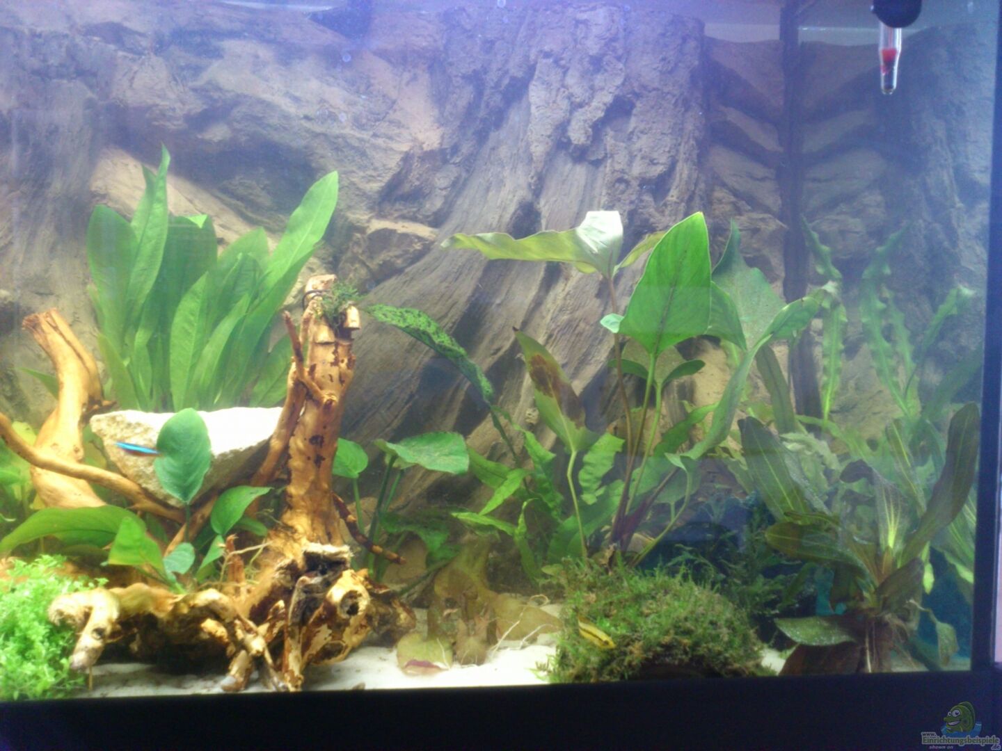 Das Becken hat eine handangefertigte Rückwand, die Felsen und Holz imitiert. Dahinter befindet sich der Heizstab und der Ansauger der Pumpe. Auch können die Fische die Rückwand hinterschwimmen und haben somit eine gute Rückzugmöglichkeit.