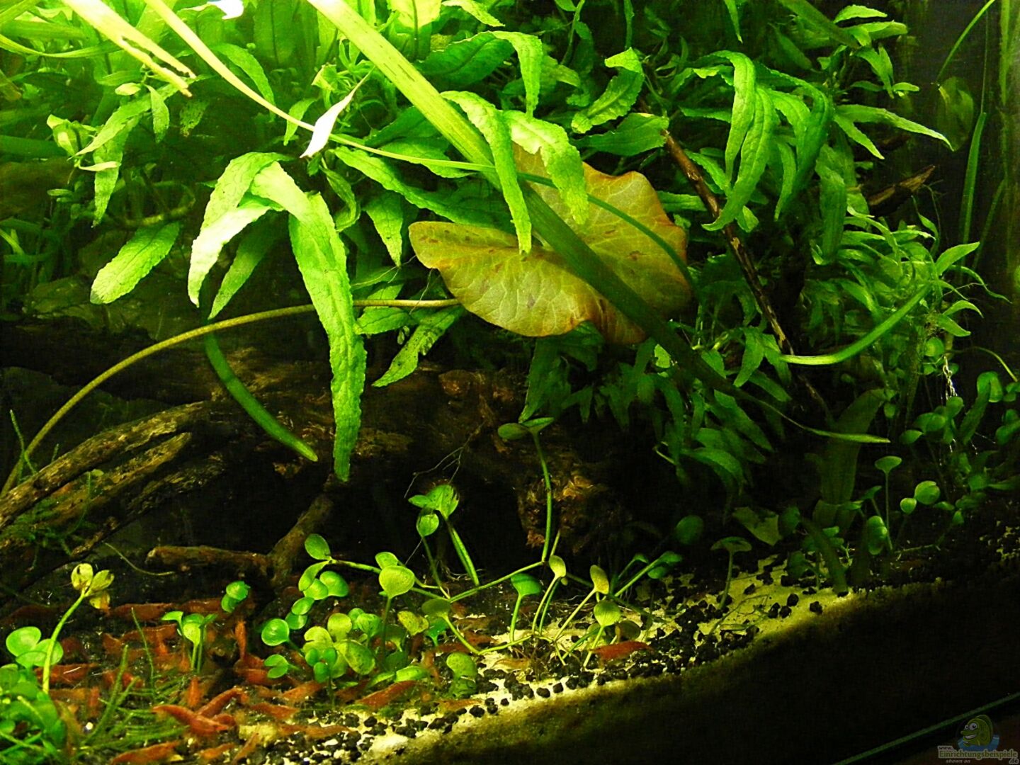 Hintergrund: 4 x Vallisneria spiralis "Tiger" 1 x Nymphaea lotus var. ´"Red" Mitte: 2 x Cryptocoryne wendtii 2 x Microsorum pteropus "Narrow" (auf Rebenholz befestigt) Vordergrund: 1 Portion Taxiphyllum barbieri 2 x Marsilea hirsuta Bei diesen Angaben handelt es sich um die Anzahl der Pflanzen, wie ich sie beim Einrichten verwendet habe. Natürlich haben sie sich mittlerweile stark vermehrt, so dass ich keine Angaben über die aktuelle [...]