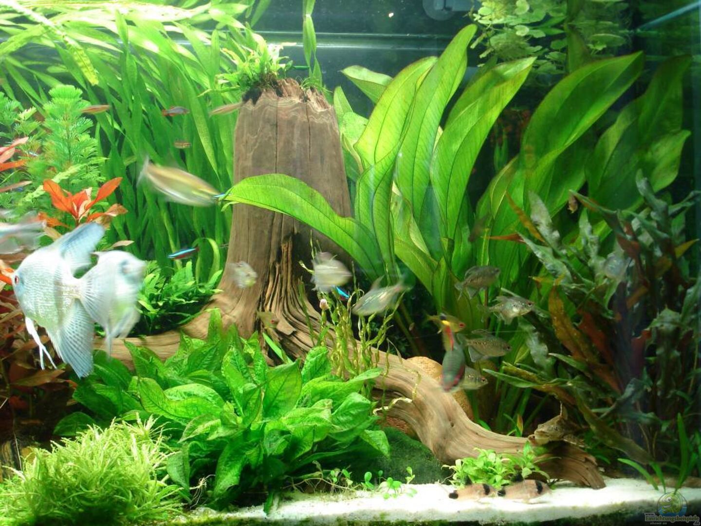 Juwel-Becken, 8 mm Float-Glas, Bodenscheibe 10 cmm Verkleidet von uns mit L-Aluschienen zur besseren Optik auf selbst gezimmertem Tisch, Filter stehen rechts und links