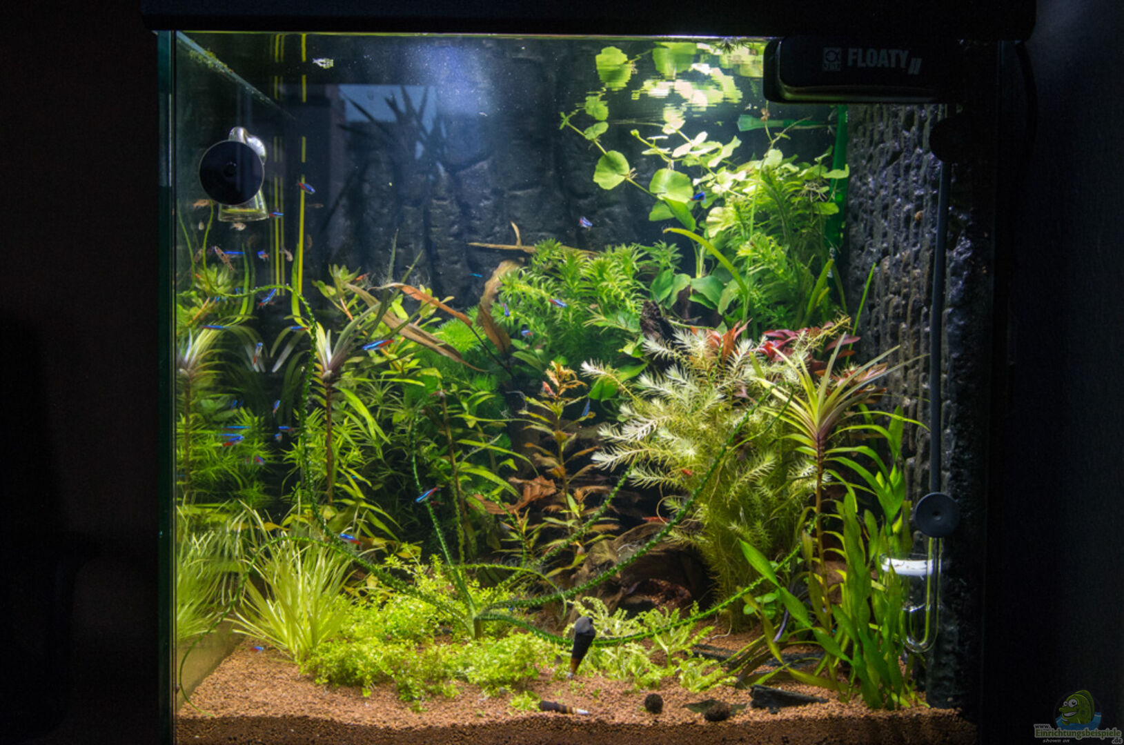 Das Aquarium besteht Eheim Scubacube 125 Kombination mit Unterschrank und Abdeckung. Das Aquarium hat folgende Ma??e: 50x50x50. Die in der Abdeckung befindlichen originalen doppelten T8-Leuchtbalken wurden entfernt, um Platz für zwei tecatlantis Easy LED-Balken zu schaffen.