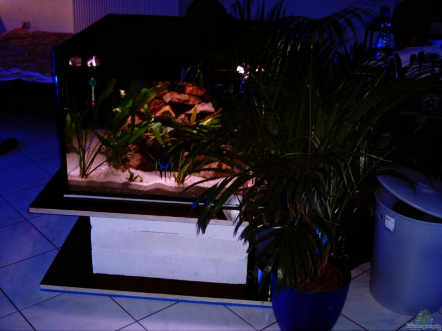 Glasstärke 10 mm Kanten geschliffen und poliert, sto??verklebt. Abdeckung: Aluprofil schwarz Unterbau aus Schalenholzplatten und Ytongsteinen. Unter dem Becken und der Bodenplatte je eine 10mm Plastazoteplatte als Unterlage. 8mm Plexiglasscheiben als Bodengrund zum Schutz der Glasscheibe.