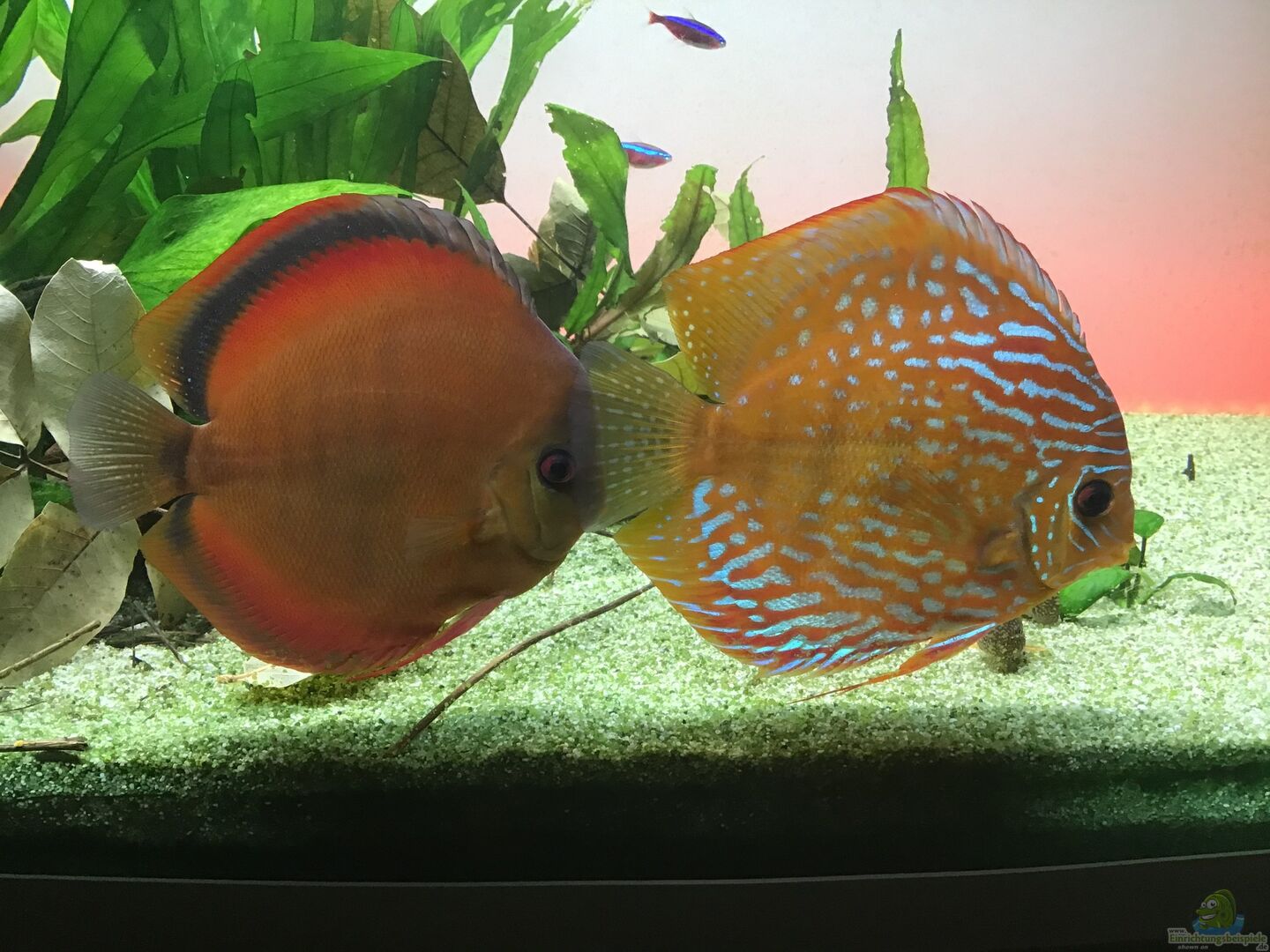 Panoramascheibe, Rückseitige Aquarienscheibe mit Sichtschutzfolie beklebt. In Verbindung mit einer Kartoneinhausung hinter dem Aquarium ein Backlight, rote 5m LED Band, silikonvergossen und über 5. Kanal des Lichtcontrollers gesteuert. Gibt stimmungsvolles rotes Licht von unten am Morgen und Abend.